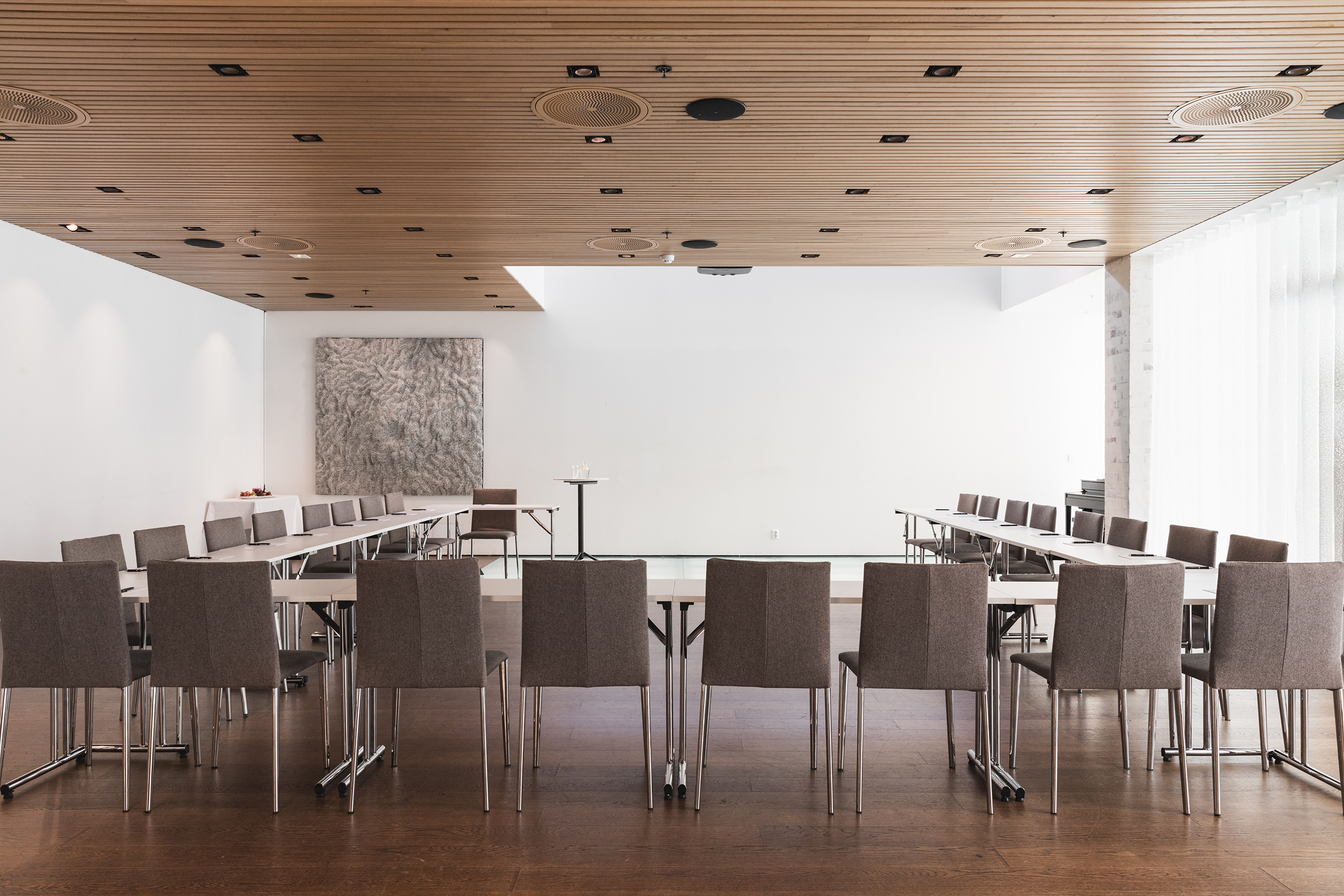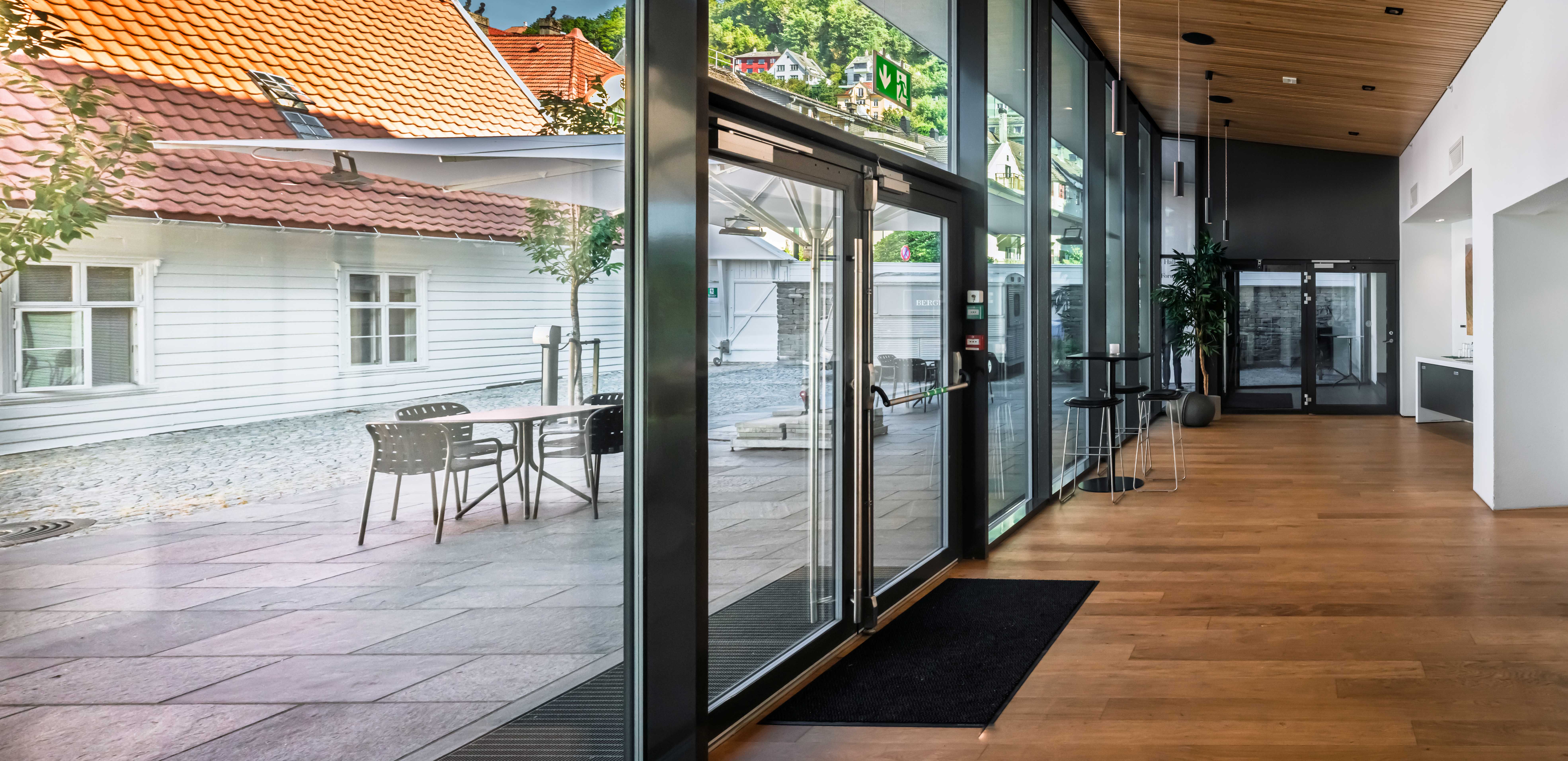 Et moderne lokale med mye dagslys og utsikt til hage. Utenfor møterommet er det et stort område for mingling, hvor også bærekraftig pausemat serveres. Dere har også direkte adgang til uteområde med sittegrupper og Villahagen.
