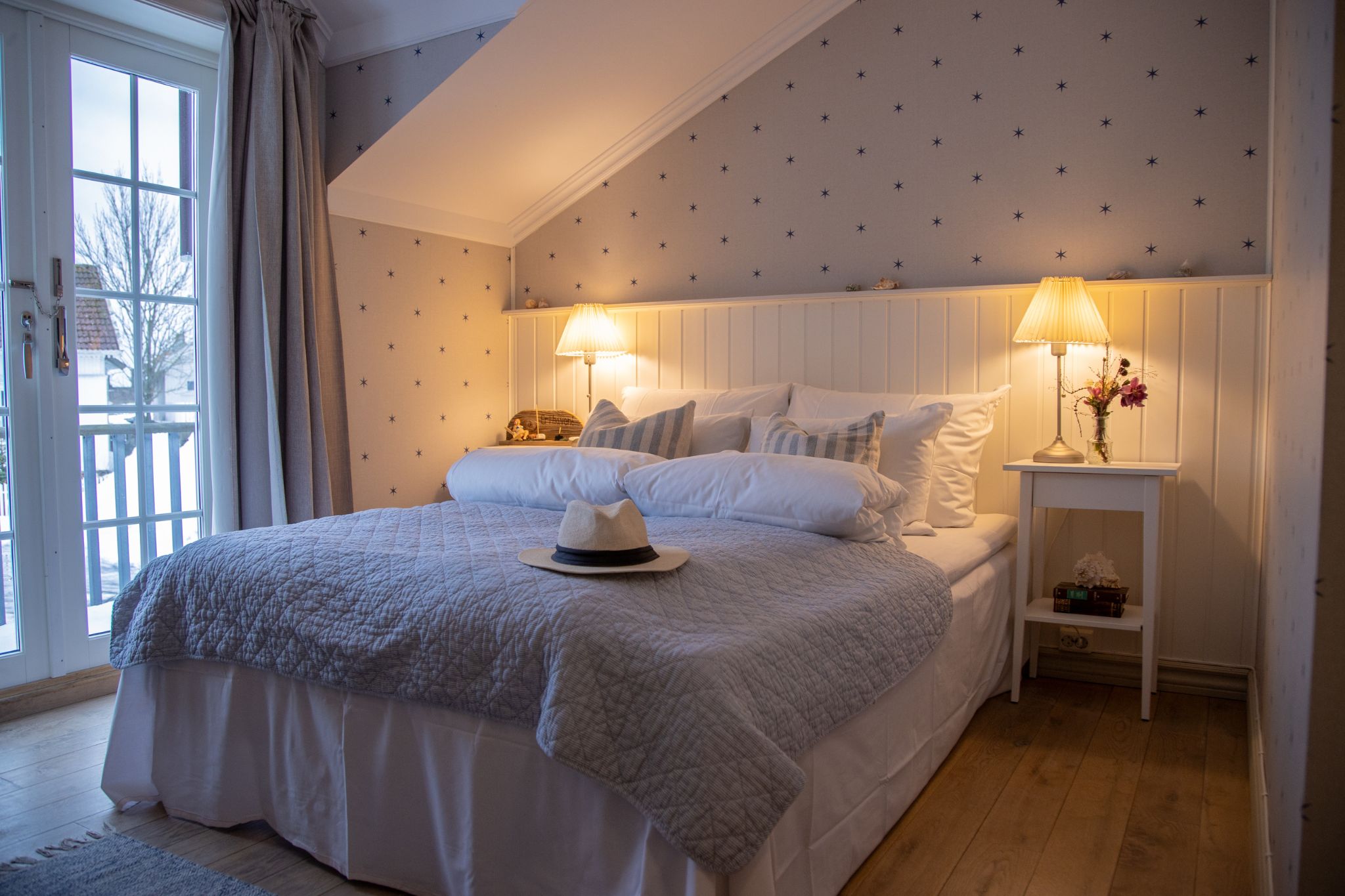 Vi har 15 vakre og komfortable dobbeltrom. Ta deg gjerne et forfriskende morgenbad før frokost, og vi kan love deg et friskt og klart hode før møtet starter. Våre møte- og selskapslokaler rommer alt fra intime grupper til større forsamlinger opp til 60 personer. Hotellet kan leies ut eksklusivt til ditt arrangement.